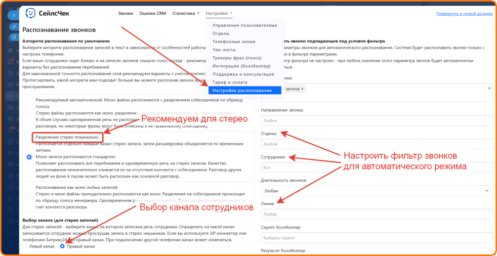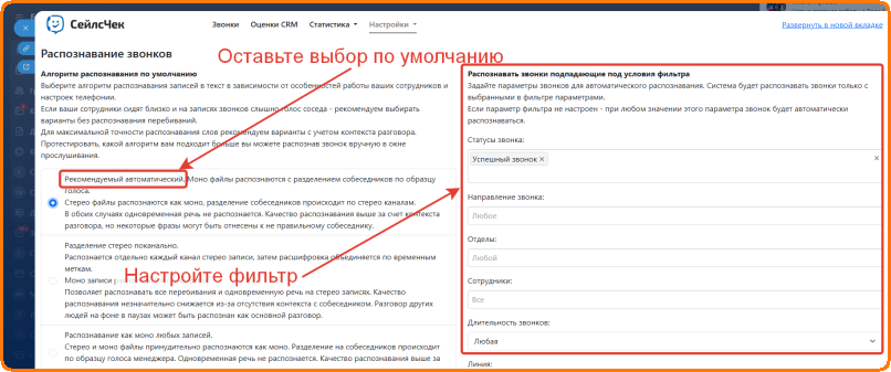 - Настройте фильтр звонков по отделам, сотрудникам и так далее - только они будут автоматически распознаваться.