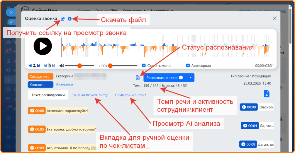 - Темп речи и % активности в диалоге (сотрудник/клиент)