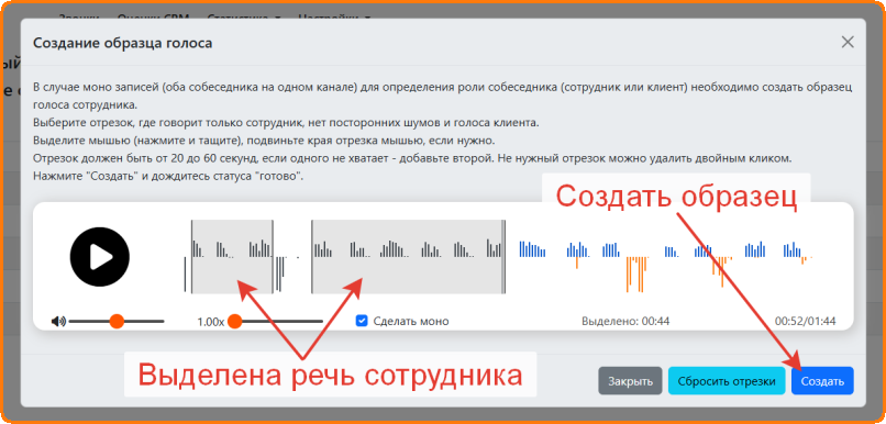 Прочтите инструкцию в окне, выделите мышью отрезки с ручью сотрудника без посторонних звуков и нажмите "Создать".