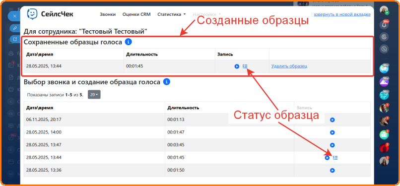 ВНИМАНИЕ: если для сотрудника не был создан образец голоса - роли в расшифровке могут быть перепутаны местами.