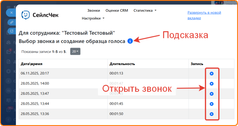 При переходе по ней СейлсЧек покажет один звонок и его можно будет сразу открыть для прослушивания и просмотра.